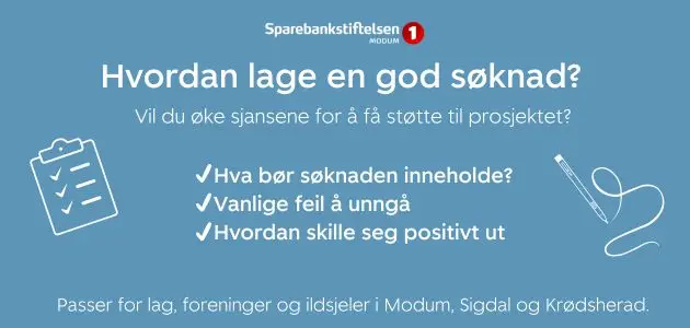 Hvert år mottar vi i Sparebankstiftelsen Modum mange gode søknader fra engasjerte lag og foreninger i Modum, Sigdal og Krødsherad. Vi vet og forstår at skuffelsen kan være stor om en søknad ikke blir innvilget. Samtidig vet vi at det er mange som setter pris på å ta en ekstra runde i arbeidsgruppe eller eget styre for å forbedre et prosjekt.